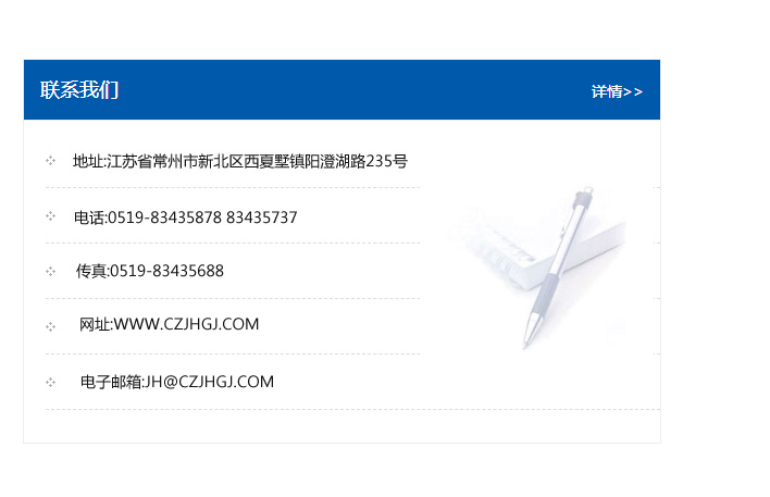 傳真:0519-83435688    郵編:213135    網址:WWW.czjhgj_com.pyjcn.com    電子郵箱:JH@czjhgj_com.pyjcn.com